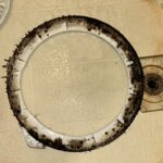 分解して洗濯槽を取り出すと、裏側には黒カビや石けんカスがぎっしり💦